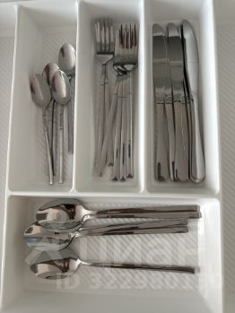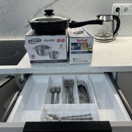 - посуда: набор на 6 персон, кастрюли, сковорода, столовые приборы