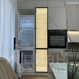 Бытовая техника: встроенный холодильник, посудомоечная машина на 60 см, электрическая варочная панель, вытяжка, духовой шкаф, стиральная машина, электрический чайник, полотенцесушитель, утюг, роутер.