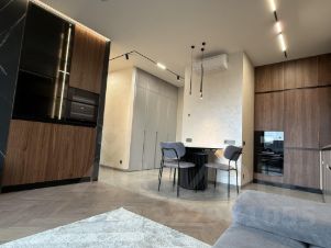 Планировка: кухня-гостиная, Две спальни, гардеробная, совмещённый и гостевой санузел, В квартире выполнен ремонт в современном стиле в светлых и темных тонах. Квартира полностью меблирована, дополнительно будет установлен большой новый телевизор Samsung.