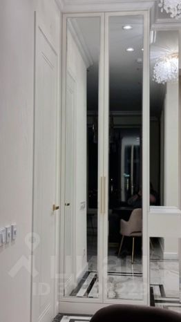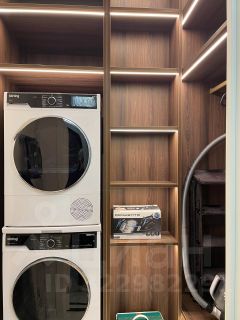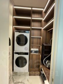 В прихожей зеркало и открывается вход в просторную, оборудованную гардеробную комнату полками, стиральной и сушильной машиной.