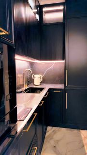Квартира (42 кв.м.) только завершился дизайнерский ремонт, планировка евро-двушка, гостиная- кухня , изолированная спальня, гардеробная комната, совмещённый санузел.