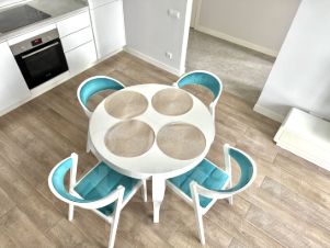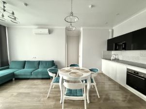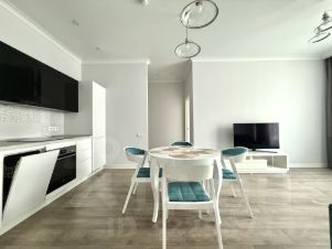 Квартира полностью меблирована и оснащена техникой Bosch (варочная панель, духовой шкаф, посудомоечная машина 45 см, СВЧ, холодильник)Отделка — ламинат Tarkett Pilot Lindberg, плитка Kerama Marazzi