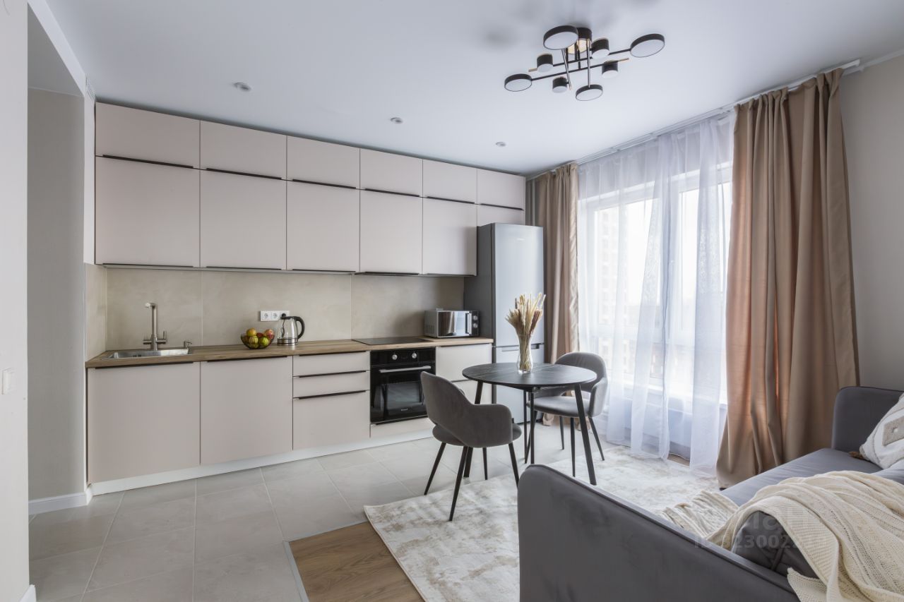 Кухня-гостиная — сердце квартиры: современный гарнитур, посудомоечная машина 60 см, духовой шкаф, варочная панель на 4 конфорки, вытяжка, микроволновка, холодильник No Frost и фильтр для воды. Пространство для отдыха оборудовано раскладным диваном, обеденным столом и мощным кондиционером — удобно и летом, и зимой.