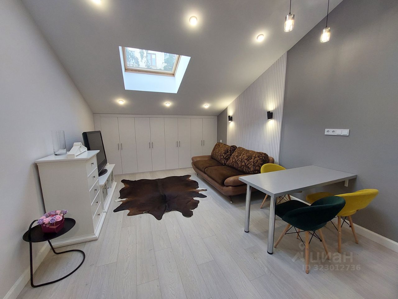 Зона отдыха с удобным диваном-трансформером, встроенные системы хранения в шкафах, тумба под телевизор, wi-fi, стильные атрибуты интерьера и продуманное освещение.