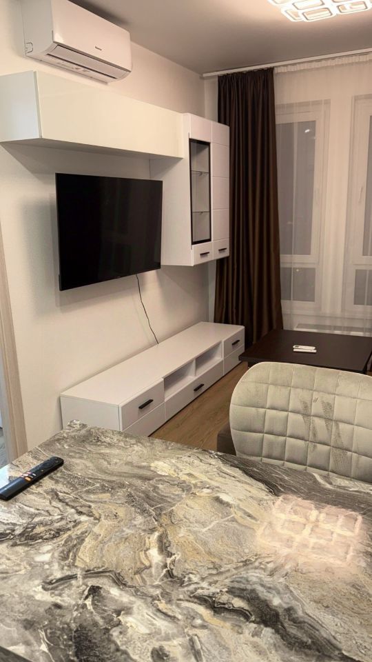 Планировка включает в себя отдельную спальню, совмещенную с гостиной кухню, смежный санузел и прихожую с гардеробом для хранения верхней одежды. Из больших окон открывается отличный вид на всю Москву. В апартаментах комфортно будет проживать 1-2 людям. В комплексе есть подземная парковка.