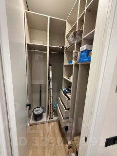 Гардеробная оснащена встроенной системой хранения как для вещей, так и для хозяйственных принадлежностей, в том числе, предусмотрена розетка для зарядки вертикального пылесоса.