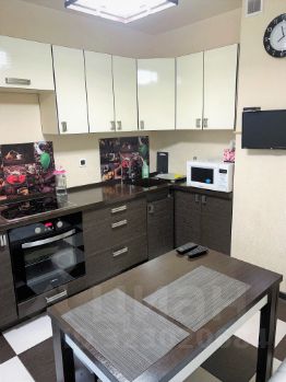 Кухня встроенная, имеет варочную электрическую плиту с стеклокерамической поверхностью и сенсорным управлением в доме газа нет, духовой шкаф, столешница с встроенной мойкой из камня, большой холодильник, микроволновая печь, эл. чайник.