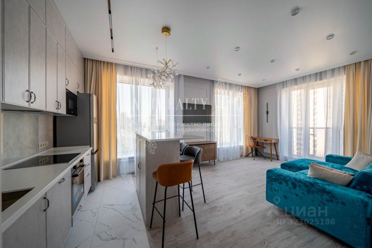 Планировка: Кухня-гостиная с островом, две спальни, ванная комната с санузлом, гостевой санузел и большая гардеробная 6м.