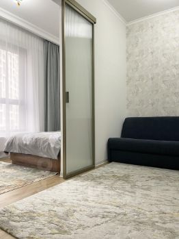 Уютная гостиная объединена с кухней, изолированная спальня с кроватью и выделенной рабочей зоной, отдельная гардеробная, шикарный с/у с ванной, просторная входная группа с встроеным шкафом.
