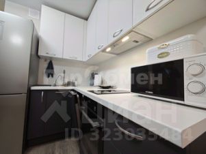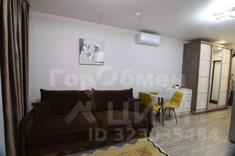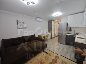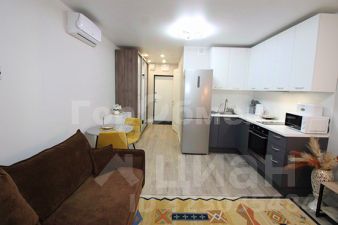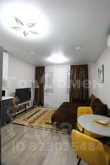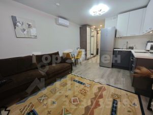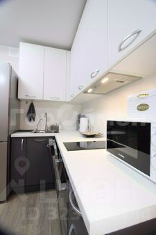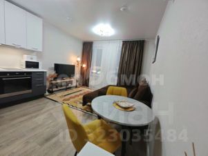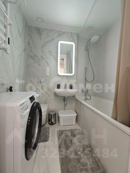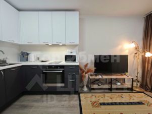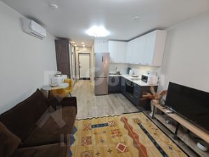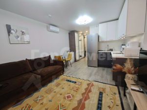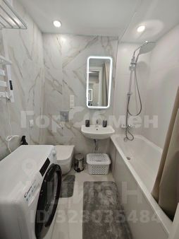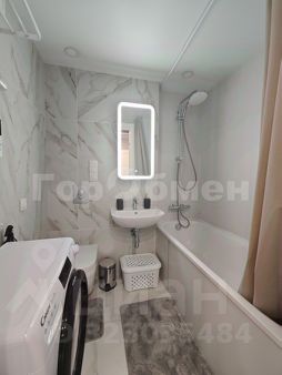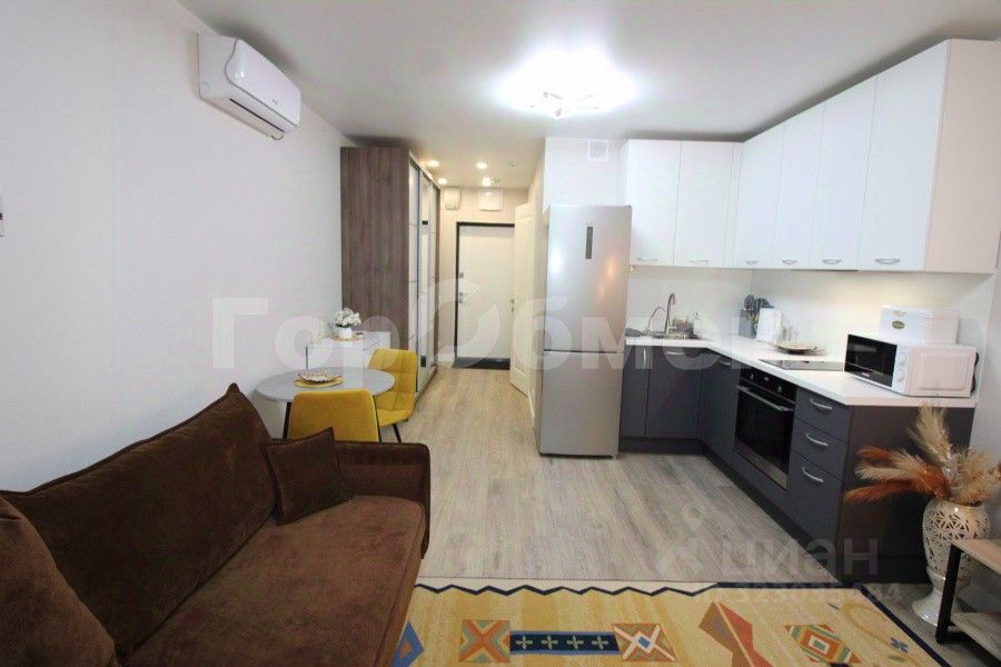 Установлена мебель (раскладной диван, шкаф купе, телевизор, микроволновая печь, стиральная машина, полотенцесушитель, зеркало, обеденная зона со столом и стульями).