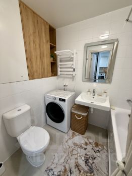• В санузле для максимального удобства и экономии пространства установлена стирально-сушильная машина.