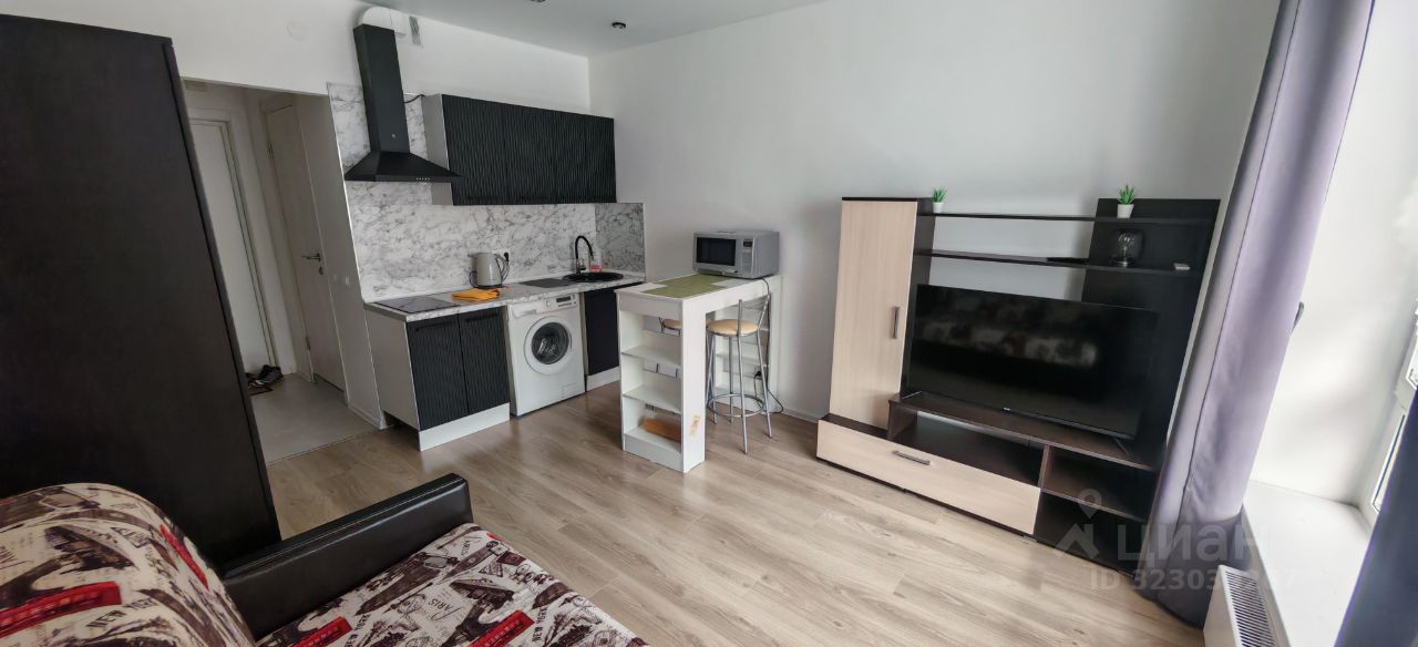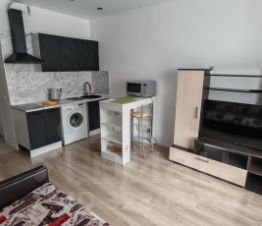 В студии сделан современный ремонт, есть вся необходимая для комфортной жизни мебель и техника (холодильник, стиральная машина, электрическая плита, микроволновая печь, чайник, телевизор).