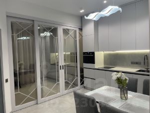 Спальню 2 и кухню разделяет красивая перегородка, позволяющая как полностью разграничить и звукоизолировать два помещения, так и объединить их в единую кухню-гостиную.