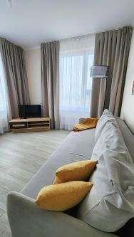 Квартира полностью мебелирована и укомплектована всей необходимой бытовой техникой. На кухне: встроенная посудомоечная машина, варочная панель, духовка, холодильник и СВЧ.