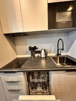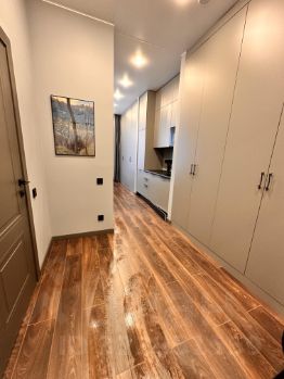 Апартаменты выполнены с дизайнерским ремонтом, что создает атмосферу уюта и гармонии. В просторной жилой зоне площадью 28 кв. м есть все необходимое: удобная мебель, кондиционер и телевизор для комфортного отдыха. Кухня площадью 5 кв. м оборудована современной техникой: холодильник, посудомоечная машина и стиральная машина. В ванной комнате установлена ванна, что позволит расслабиться после рабочего дня.