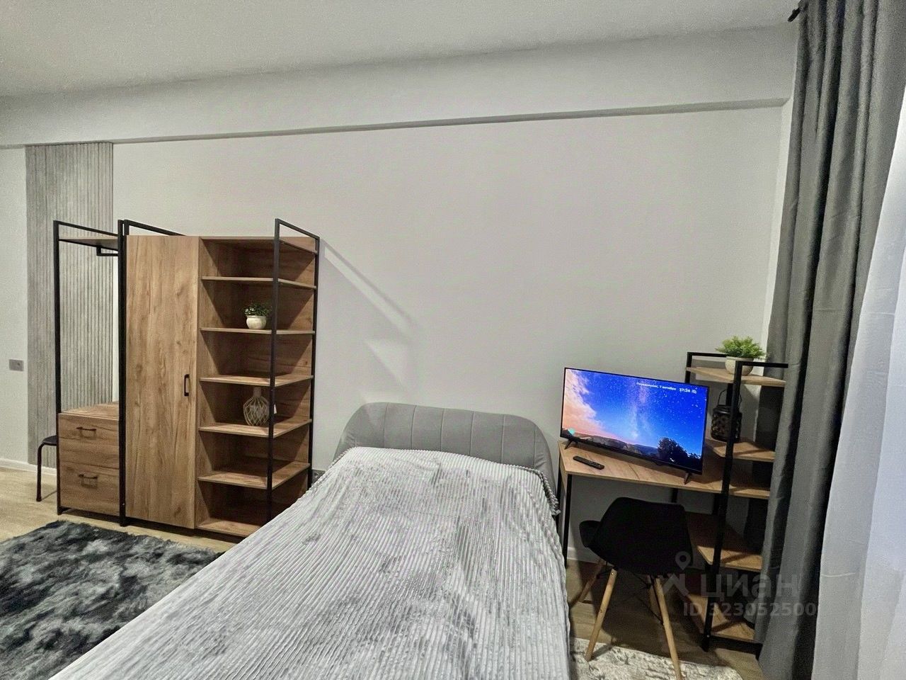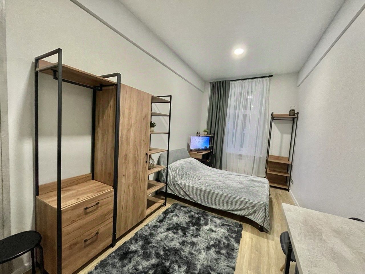 Потолки 3 м. визуально увеличивают пространство, имеется зона отдыха с удобной двуспальной кроватью, оборудованное рабочее место, кухня с необходимой посудой и техникой, вместительный шкаф и полки для хранения.