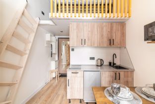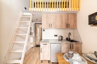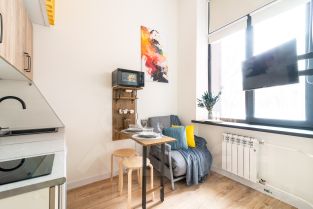 оборудованная кухня с индукционной плитой, холодильником, микроволновкой и электрическим чайником;