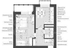 Техника: холодильник, стиральная машина, плита, вытяжка, духовой шкаф, посудомоечная машина, утюг, инверторный кондиционер.