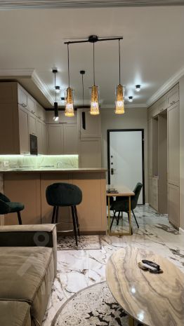 В квартире есть всё необходимое для комфортного проживания: кондиционер, холодильник, посудомоечная машина, телевизор и стиральная машина, сушильная машина. Вся бытовая техника Miele. Обстановка стильная и современная, мебель установлена на кухне и в комнате. Санузел совмещённый, оборудован душевой кабиной.