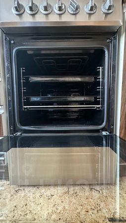 Светлая большая кухня оснащена хорошим холодильником и современной электрической плитой.