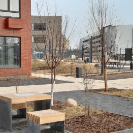 Большое окно с красивым видом на благоустроенный двор, на запад по вечерам красивые закаты.