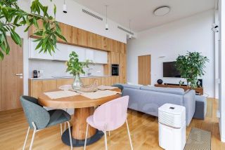 Интерьер квартиры выполнен в современном скандинавском стиле, что создаёт атмосферу уюта и гармонии. Использование натурального дерева, мягких оттенков и максимум света делает пространство по-настоящему живым. Мебель от Bo Concept и сантехника от Grohe, а также встроенная техника премиум-класса, обеспечивают высокий уровень комфорта и функциональности. Квартира полностью укомплектована и готова к проживанию — всё новое, качественное и безупречно чистое.