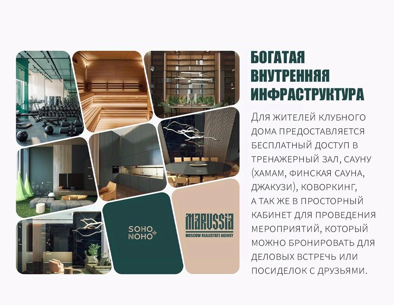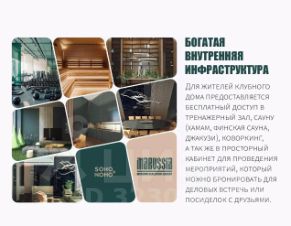 Для жителей дома предоставляется БЕСПЛАТНЫЙ доступ к клубной инфраструктуре: тренажерный зал, сауну (хамам, финская сауна, джакузи), просторный кабинет для проведения мероприятий, который можно бронировать бесплатно для деловых встреч и встреч с друзьями, коворкинг. Достойное окружение, дружное соседское комьюнити. На территории дома есть беговое сообщество *иногда соседи собираются поиграть в мафию или сходить в спа.