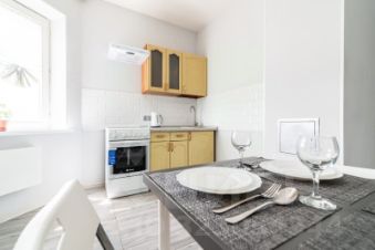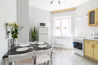 оборудованная кухня с варочной панелью, духовкой, микроволновкой, холодильником и электрическим чайником;