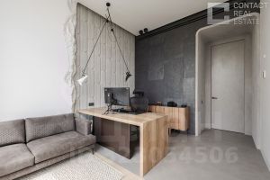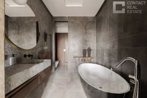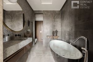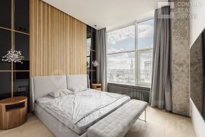 Квартира очень светлая, благодаря панорамному остеклению и высоким потолкам. Всё готово к заселению: выполнена дизайнерская отделка с использованием дорогих и качественных материалов, сантехникой и техникой европейских брендов. Мебель делалась на заказ: тумбы прикроватные из Испании и США, стол в гостиной от итальянского производителя. Кровати также сделаны на заказ, по образцу известного испанского бренда Angel Cerda. Свет — от "Центрсвет". Интерьер и фото — от именитой студии Hills Design Studio.