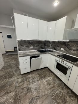 -просторная кухня содержит угловой мебельный гарнитур с подсветкой и с встроенными посудомоечной машиной 45см, индукционной варочной панелью, духовкой, вытяжкой, кварцевой раковиной. Также имеется холодильник, микроволновая печь, эл.чайник и вся необходимая кухонная утварь (посуда, приборы и пр.). Вся техника хороших производителей, таких как Bosch. На кухне огромная застекленная лоджия по размеру как мини комната;