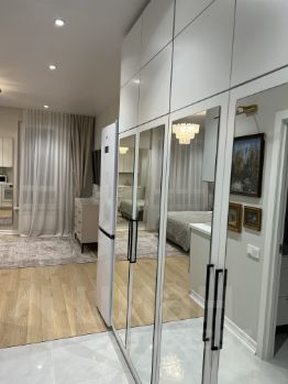- Встроенная кухня: варочная панель, духовка, вытяжка, микроволновая печь, холодильник
