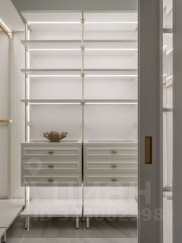 За акцентными дверями скрывается гардеробная с удобной системой хранения: полки, ящики, пьедесталы для сумок и обуви. Всё устроено так, чтобы каждая вещь имела своё место.