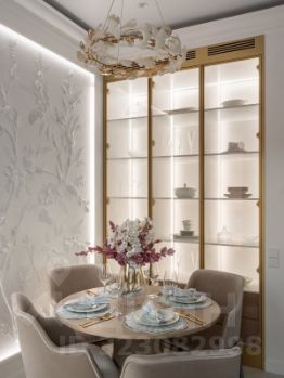 Главное пространство квартиры — кухня-гостиная с панорамными окнами. Здесь остров становится центром жизни: за ним удобно готовить и встречать закаты. Встроенная техника, стеклянный шкаф с посудой, круглый стол на шесть персон и мягкий диван — всё уже готово к повседневности и праздникам. Атмосферу меняет сценарное освещение: одним нажатием пространство становится то ярким и рабочим, то мягким и вечерним.