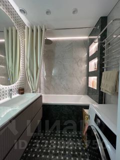 В ванной: тропический душ, смеситель с терморегулятором, стиральная машина, вместительная подвесная тумба, полотенцесушитель, теплый пол