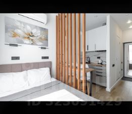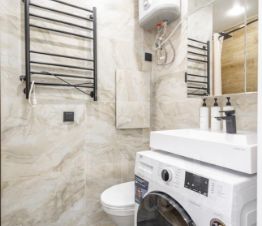 В квартире выполнен качественный евроремонт. Пространство студии умело зонировано: кухня и зона отдыха с мебелью создают комфорт и удобство. Ванная комната оборудована современной душевой кабиной. В квартире есть всё необходимое для комфортного проживания: кондиционер, холодильник, телевизор и стиральная машина.