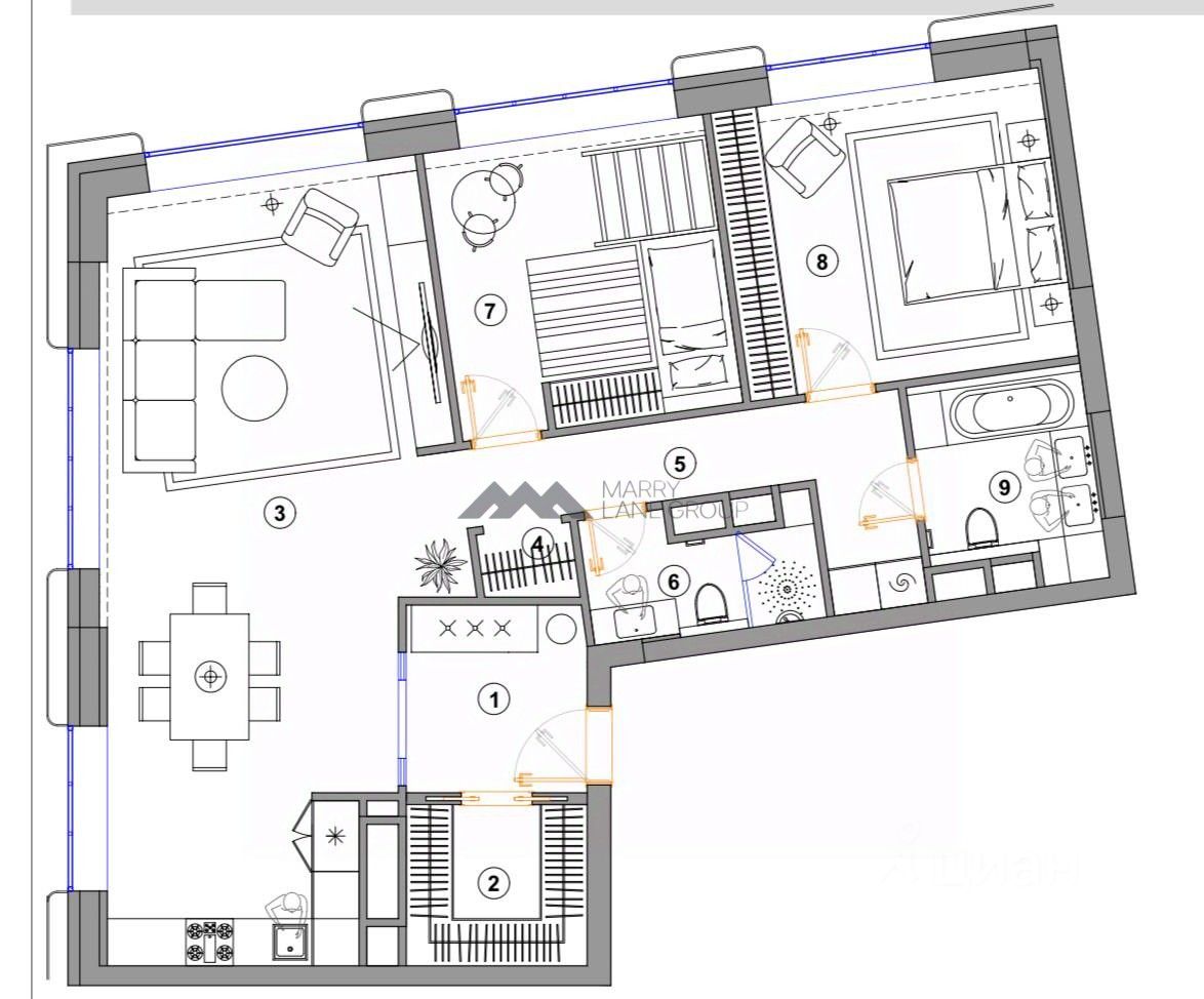 Площадь 103,2м2. Планировка объекта угловая, большие окна выходят сразу на 2 стороны.