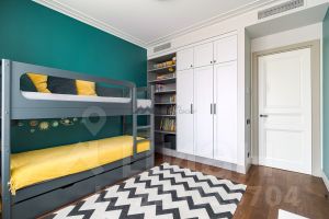 В детской комнате размером около 13м2 установлена двухуровневая кровать, есть игровое (рабочее) место и дополнительная система хранения.
