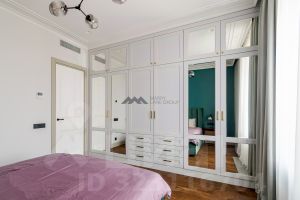 В спальне размером 15м2 установлена большая двуспальная кровать и линия встроенных шкафов.
