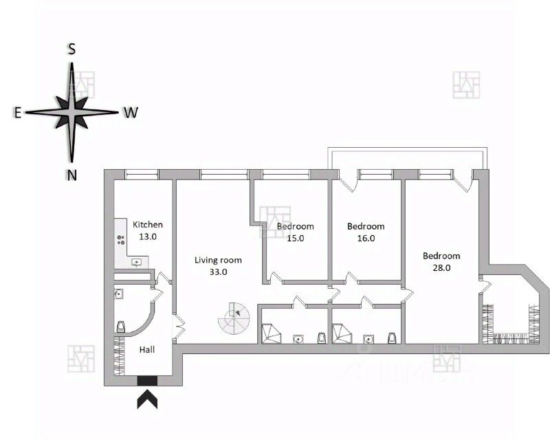 Уникальная 4х-комнатная квартира с тремя спальнями, тремя санузлами, гардеробной, просторной гостиной из которой можно по винтовой лестнице подняться на эксплуатируемую крышу-террасу.