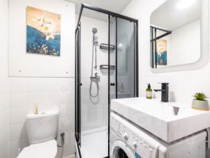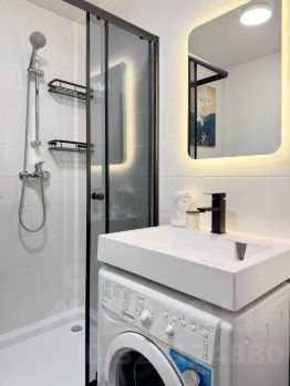 - санузел (душевая кабина, стиральная машина, зеркало полочки, полочки)