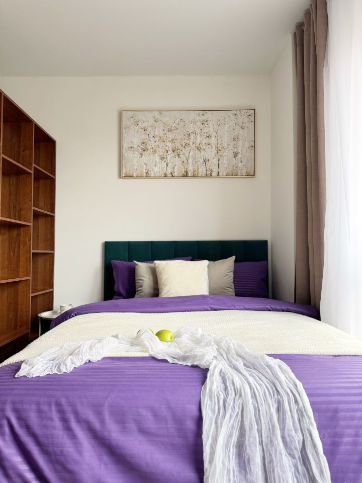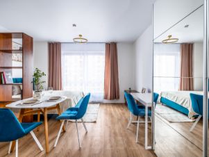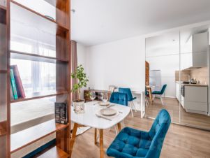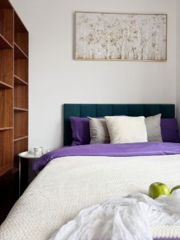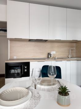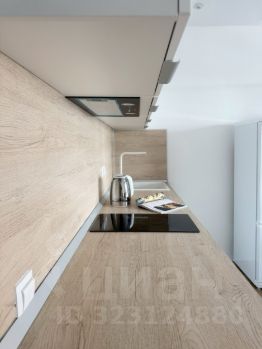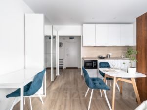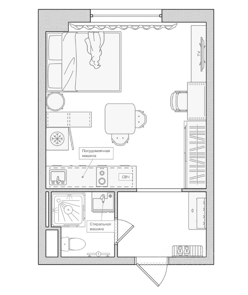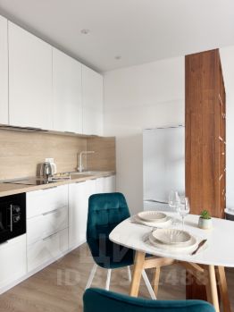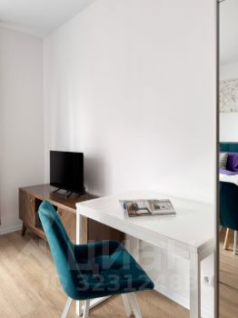 - кухня-гостиная (двуспальная кровать с подъемным механизмом и местом для хранения, стеллаж, отделяющий спальную зону от от кухонной, телевизор, большой шкаф, письменный стол, тумба, кухонный гарнитур, встроенная посудомойка, холодильник, СВЧ, плита, вытяжка, обеденный стол с мягкими стульями )