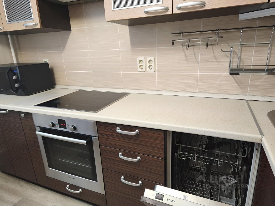 На кухне также имеется всё необходимое для комфортного пользования: кухонный гарнитур, бытовая техника - посудомоечная машина, холодильник, микроволновая печь и электроплита. Санузел и ванная также полностью отремонтированы, в ванной имеется стиральная машинка - автомат.