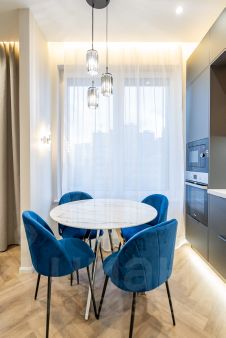 Сдается стильная однокомнатная квартира с дизайнерским ремонтом в современном доме 2022 года постройки. Общая площадь квартиры составляет 36,7 кв. м, с просторной жилой зоной в 10 кв. м и кухней аналогичной площади. Квартира расположена на 5 этаже 28-этажного монолитного дома с высотой потолков 3,12 метра. Окна выходят на улицу, обеспечивая хорошее естественное освещение.