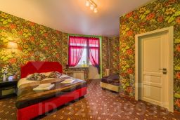 В комнате одна большая двуспальная кровать, одна односпальная кровать, стол, стул, чайные принадлежности, чайник, холодильник, плоский телевизор, шкаф.