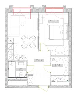 Кухня-гостиная и прихожая - 24,5 м² объединяют функциональность и уют: установлен кухонный гарнитур с варочной панелью, духовым шкафом, посудомоечной машиной (45 см), фильтром питьевой воды и холодильником