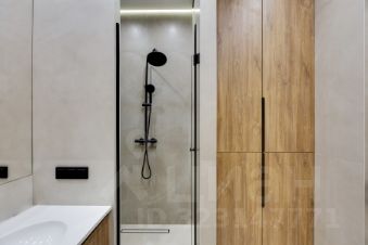 Санузел: душевая кабина, стиральная машина, дополнительные места для хранения.