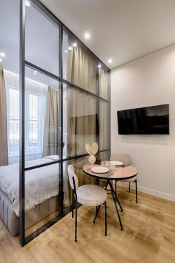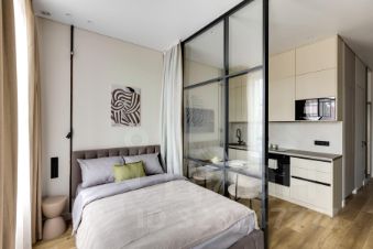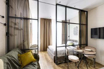 • Зона спальни отделена от гостиной воздушной стеклянной перегородкой