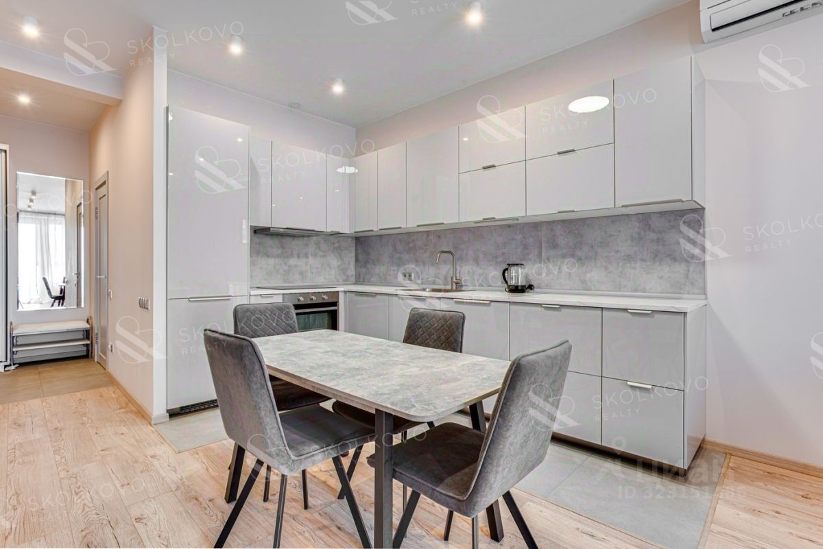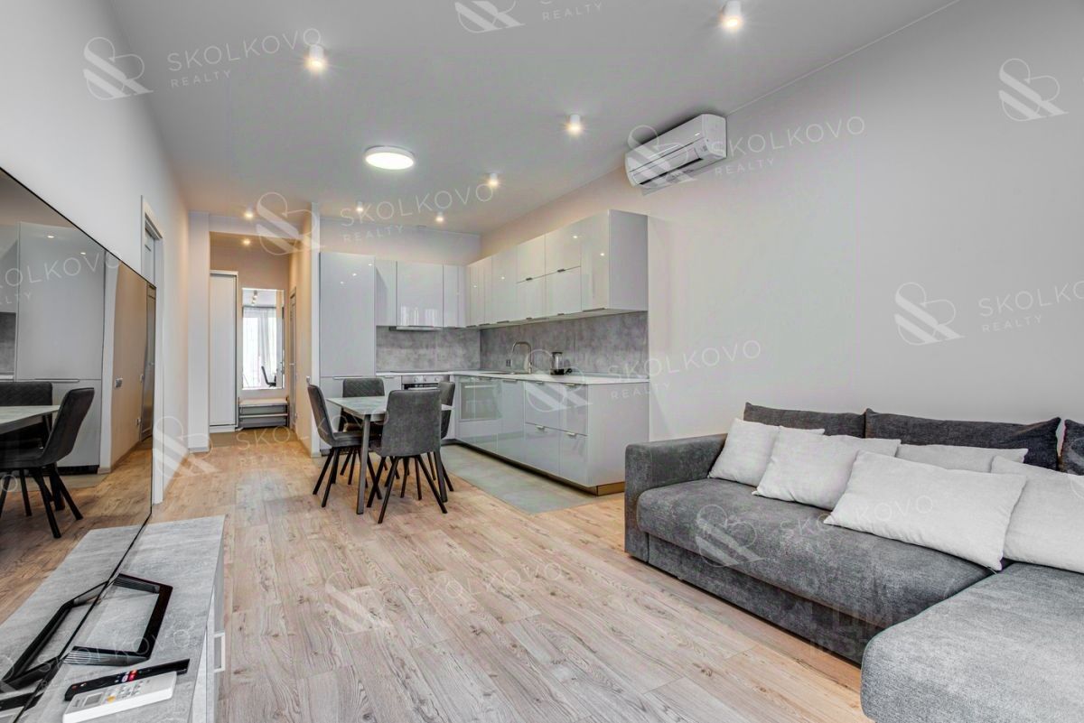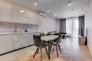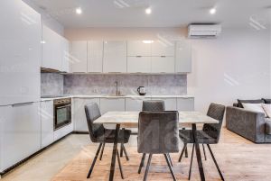 Квартира полностью меблированная и оснащена всей необходимой техникой для комфортного проживания. Кухня площадью 20 кв. м укомплектована современной техникой: холодильником, посудомоечной и стиральной машиной, а также кондиционером.