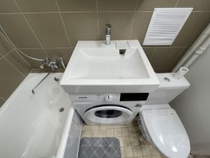 в спальне - просторная гардеробная, двуспальная кровать, комод с зеркалом и прикроватные тумбы, в гостиной - шкаф-купе и компьютерный стол, раскладной диван. В обеих комнатах шторы блекаут (blackout). В санузле новый унитаз, раковина и смеситель, новый зеркальный шкафчик, а также только что покрытая акрилом ванна.