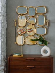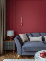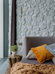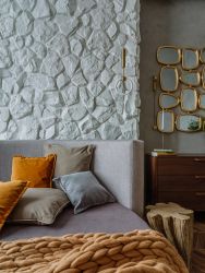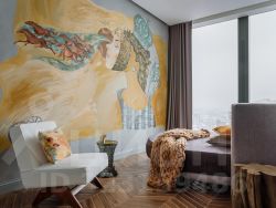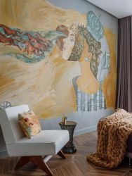 Круглая кровать, большой шкаф, кресло, комод и авторская фреска на стене - в стильной спальне.